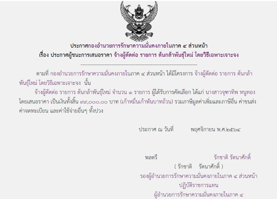 ประกาศผู้ชนะการเสนอราคา จ้างผู้ติดต่อ รายการ ต้นกล้าพันธุ์ใหม่ โดยวิธีเฉพาะเจาะจง