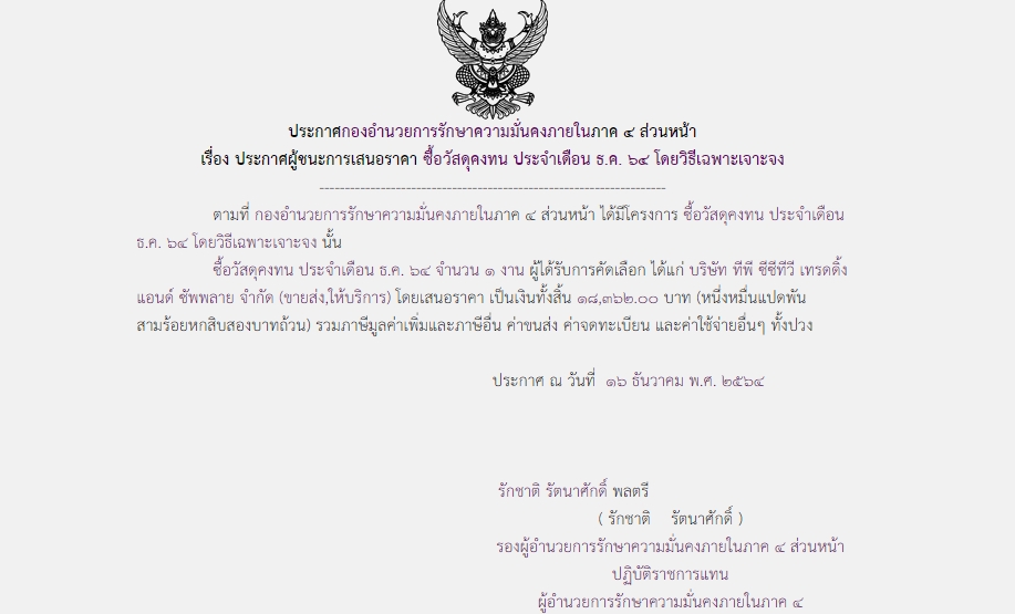 ประกาศผู้ชนะการเสนอราคา ซื้อวัสดุคงทน ประจำเดือน ธ.ค. ๖๔ โดยวิธีเฉพาะเจาะจง