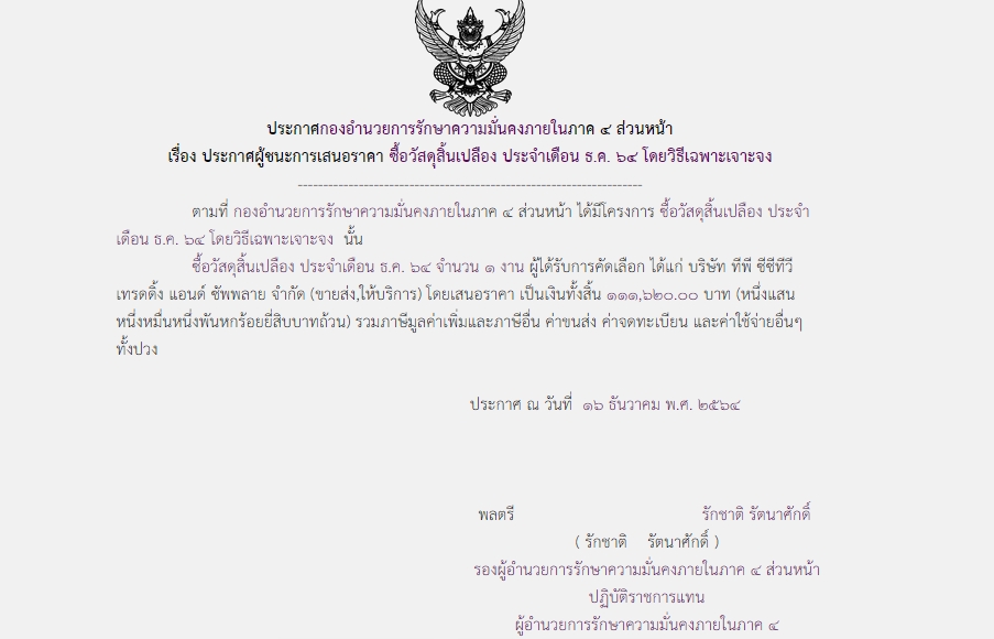 ประกาศผู้ชนะการเสนอราคา ซื้อวัสดุสิ้นเปลือง ประจำเดือน ธ.ค. ๖๔ โดยวิธีเฉพาะเจาะจง