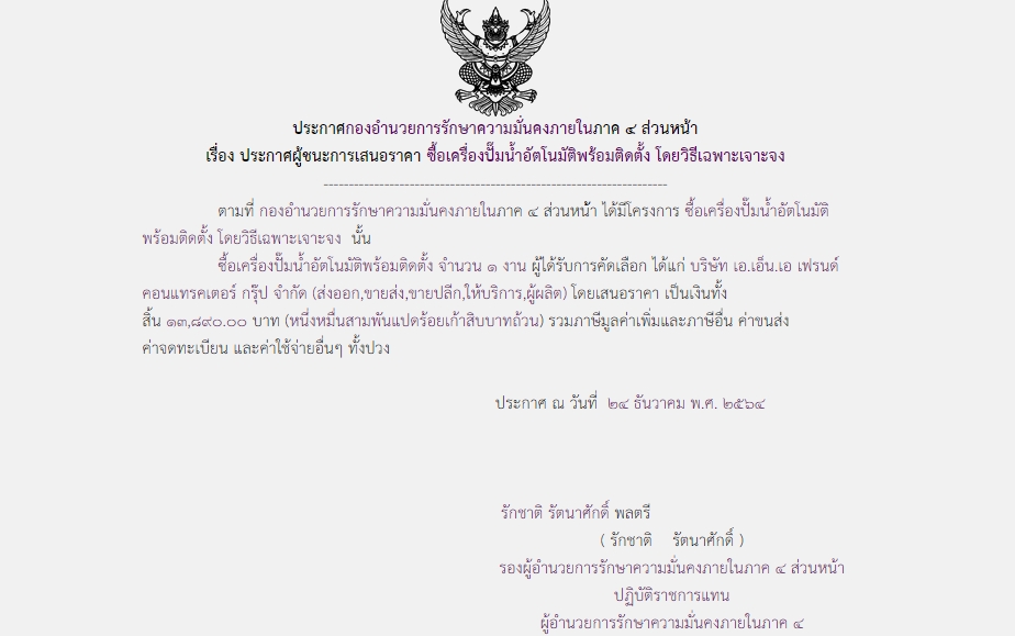 จัดซื้อ จัดจ้างประกาศผู้ชนะการเสนอราคา ประกาศผู้ชนะการเสนอราคา ซื้อเครื่องปั้มน้ำอัตโนมัติพร้อมติดตั้ง โดยวิธีเฉพาะเจาะจง December 29, 2021 425 Share Facebook Twitter Google+ Telegram LINE