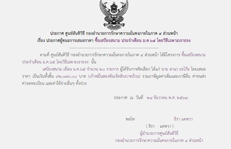 ประกาศผู้ชนะการเสนอราคา ซื้อเสบียงสนาม ประจำเดือน ม.ค. ๖๕ โดยวิธีเฉพาะเจาะจง