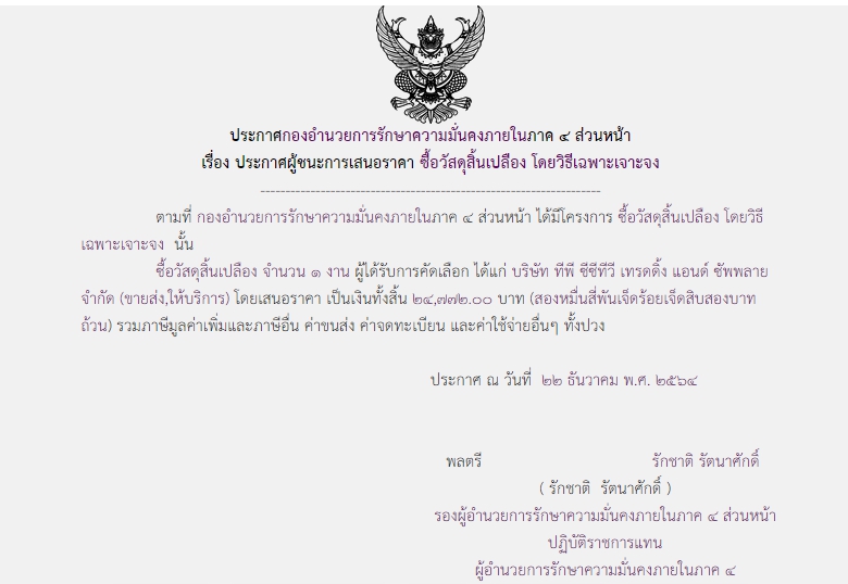 ประกาศผู้ชนะการเสนอราคา ซื้อวัสดุสิ้นเปลือง โดยวิธีเฉพาะเจาะจง