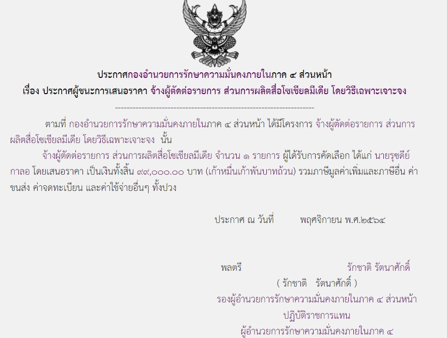 ประกาศผู้ชนะการเสนอราคา จ้างผู้ตัดต่อรายการ ส่วนการผลิตสื่อโซเชียลมีเดีย โดยวิธีเฉพาะเจาะจง