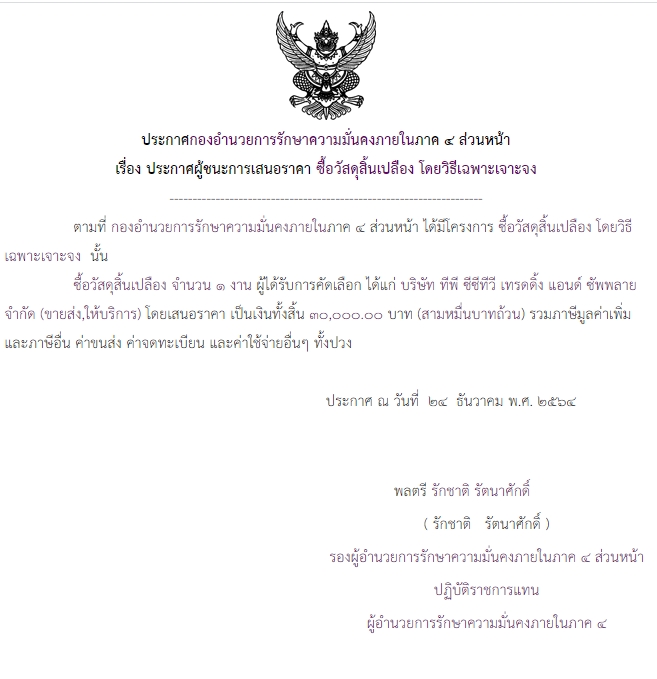 ประกาศผู้ชนะการเสนอราคา ซื้อวัสดุสิ้นเปลือง โดยวิธีเฉพาะเจาะจง