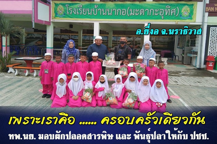 หน่วยเฉพาะกิจกรมทหารพรานนาวิกโยธิน กองทัพเรือ ลงพื้นที่โรงเรียนบ้านนากอ (มะดะกะอุทิศ) หมูที่ 6 ตำบลจอเบาะ อำเภอยี่งอ จังหวัดนราธิวาส เพื่อมอบผักสวนครัวจากศูนย์เรียนรู้เศรษฐกิจพอเพียงที่ กองร้อยทหารพรานนาวิกโยธินที่ 7 ได้ปลูกไว้แบบระบบไฮโดรโปนิกส์ ให้โรงเรียนได้นำมาประกอบเป็นอาหารกลางวันภายในโรงเรียน เพื่อส่งเสริมโครงการอาหารกลางวันของโรงเรียน โดยเป็นผักปลอดสารพิษ โดยมี นายนริศ นิมอ ผู้อำนวยการโรงเรียนบ้านนากอ เป็นผู้รับมอบ
