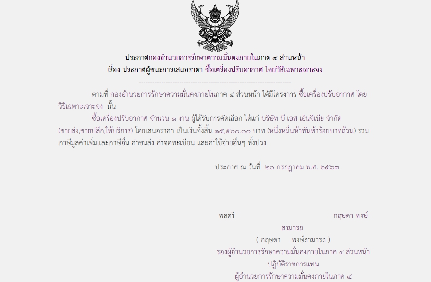 ประกาศผู้ชนะการเสนอราคา ซื้อเครื่องปรับอากาศ โดยวิธีเฉพาะเจาะจง (15,500.00)