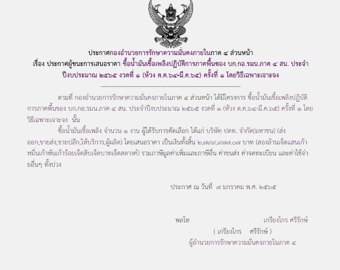 จัดซื้อ จัดจ้างประกาศผู้ชนะการเสนอราคา ประกาศผู้ชนะการเสนอราคา ซื้อน้ำมันเชื้อเพลิงปฏิบัติการภาคพื้นของ บก.กอ.รมน.ภาค ๔ สน. ประจำปีงบประมาณ ๒๕๖๕ งวดที่ ๑ (ห้วง ต.ค. ๖๔ – มี.ค. ๖๕) ครั้งที่ ๑ โดยวิธีเฉพาะเจาะจง January 9, 2022 445 Share Facebook Twitter Google+ Telegram LINE