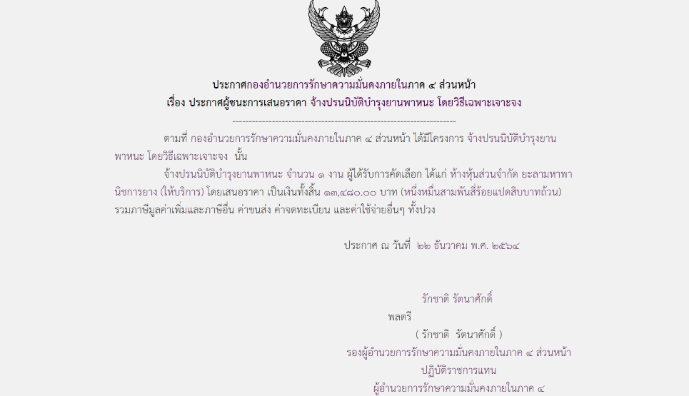 ประกาศผู้ชนะการเสนอราคา จ้างปรนนิบัติบำรุงยานพาหนะ โดยวิธีเฉพาะเจาะจง