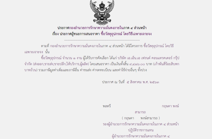 ประกาศผู้ชนะการเสนอราคา ซื้อวัสดุอุปกรณ์ โดยวิธีเฉพาะเจาะจง(๔)