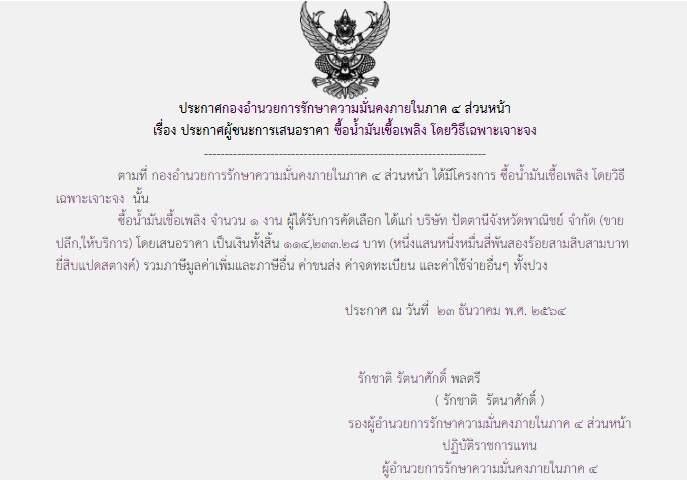 ประกาศผู้ชนะการเสนอราคา ซื้อน้ำมันเชื้อเพลิง โดยวิธีเฉพาะเจาะจง