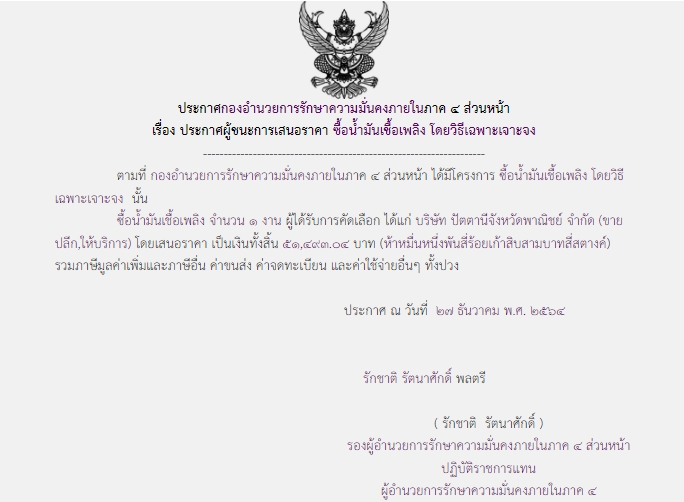 ประกาศผู้ชนะการเสนอราคา ซื้อน้ำมันเชื้อเพลิง โดยวิธีเฉพาะเจาะจง