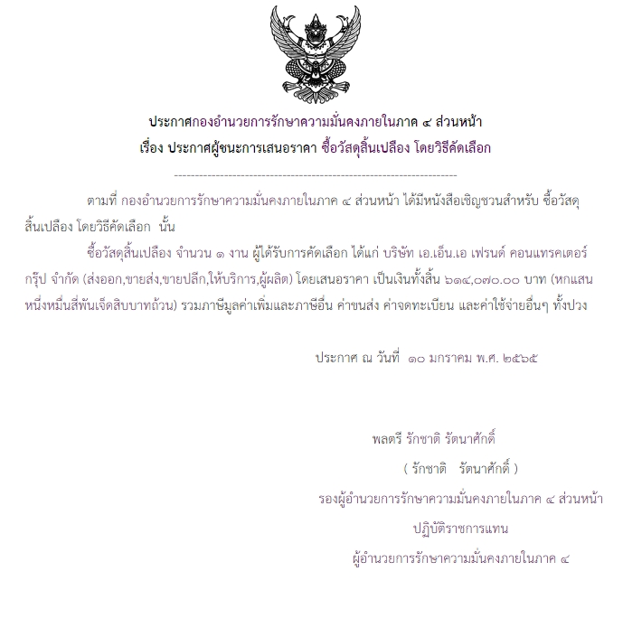 ประกาศผู้ชนะการเสนอราคา ซื้อวัสดุสิ้นเปลือง โดยวิธีคัดเลือก