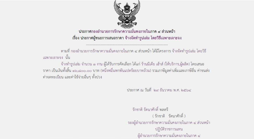 ประกาศผู้ชนะการเสนอราคา จ้างจัดทำรูปเล่ม โดยวิธีเฉพาะเจาะจง
