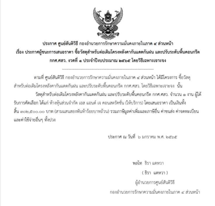 จัดซื้อ จัดจ้างประกาศผู้ชนะการเสนอราคา ประกาศผู้ชนะการเสนอราคา ซื้อวัสดุสำหรับต่อเติมโครงหลังคากันแดดกันฝน และปรับระดับพื้นคอนกรีต กกศ.ศสว. งวดที่ ๑ ประจำปีงบประมาณ ๒๕๖๕ โดยวิธีเฉพาะเจาะจง January 11, 2022 541 Share Facebook Twitter Google+ Telegram LINE