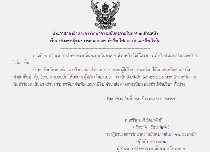ประกาศผู้ชนะการเสนอราคา ทำป้ายโฟมบอร์ด และป้ายไวนิล (33,560 บาท)