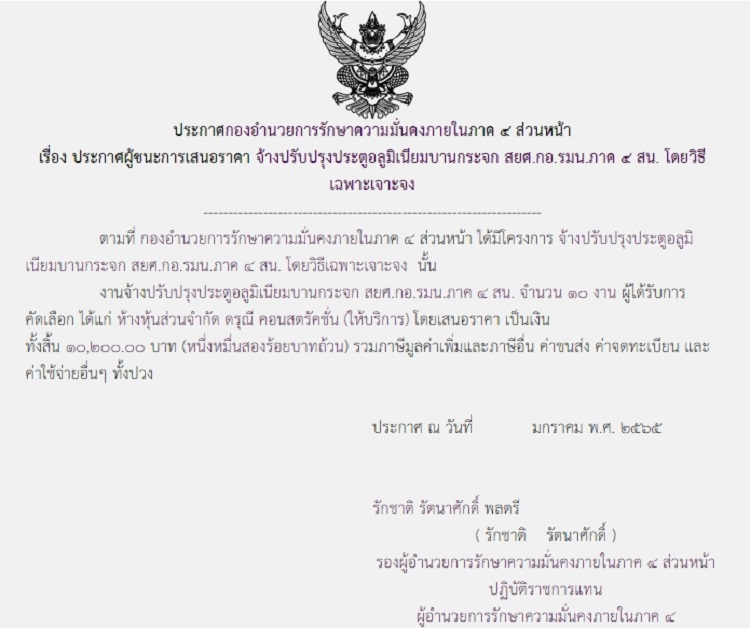 จัดซื้อ จัดจ้างประกาศผู้ชนะการเสนอราคา ประกาศผู้ชนะการเสนอราคา จ้างปรับปรุงประตูอลูมิเนียมบานกระจก สยศ.กอ.รมน.ภาค 4 สน. โดยวิธีเฉพาะเจาะจง (10,200 บาท) January 11, 2022 655 Share Facebook Twitter Google+ Telegram LINE