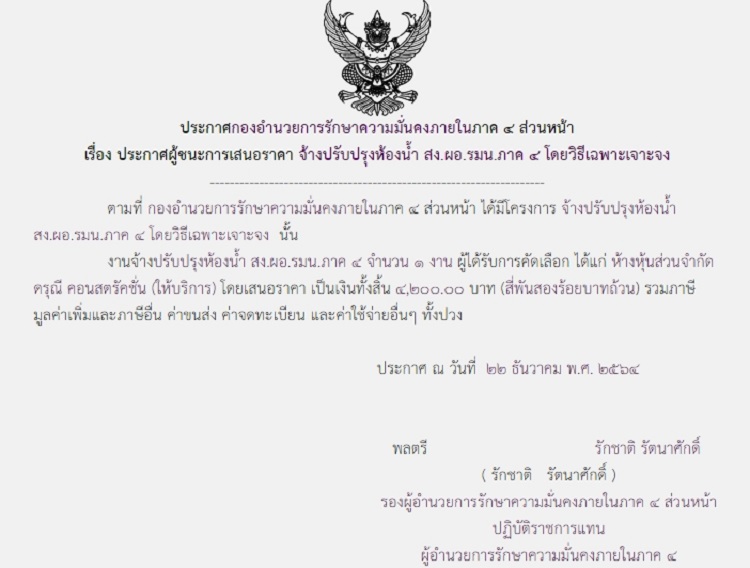 ประกาศผู้ชนะการเสนอราคา จ้างปรับปรุงห้องน้ำ สง.ผอ.รมน.ภาค 4 โดยวิธีเฉพาะเจาะจง (4,200 บาท)