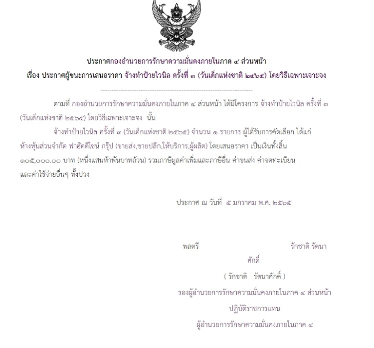 ประกาศผู้ชนะการเสนอราคา จ้างทำป้ายไวนิล ครั้งที่ 3 (วันเด็กแห่งชาติ 2565) โดยวิธีเฉพาะเจาะจง (105,000 บาท)