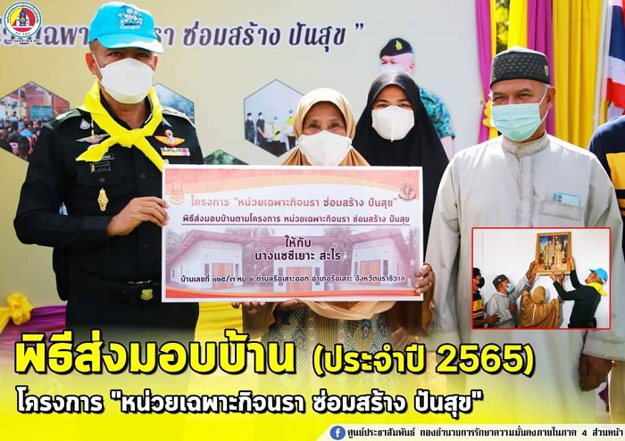 เมื่อวันที่ 15 มกราคม 2565 เวลา 10.00 น. ณ บ้านเลขที่ 125/1 หมู่ที่ 2 ต.รือเสาะออก อ.รือเสาะ จ.นราธิวาส พลตรี อุทิศ อนันตนานนท์ รองผู้อำนวยการรักษาความมั่นคงภายในภาค 4 ส่วนหน้า เดินทางมาเป็นประธานในพิธีมอบบ้าน พร้อมมอบ ชุดเครื่องนอน และเครื่องอุปโภค บริโภค ตามโครงการ “หน่วยเฉพาะกิจนรา ซ่อมสร้าง ปันสุข” ให้กับ นางแซซีเย๊าะ สะไร โดยมี ผู้บังคับหน่วยเฉพาะกิจนราธิวาส นายอำเภอรือเสาะ ผู้บังคับหน่วยเฉพาะกิจกรมทหารพรานที่ 46 ผู้กำกับการสถานีตำรวจภูธรรือเสาะ นายกองค์การบริหารส่วนตำบลรือเสาะออก ผู้นำท้องที่ ผู้นำท้องถิ่น และประชาชนร่วมให้การต้อนรับ