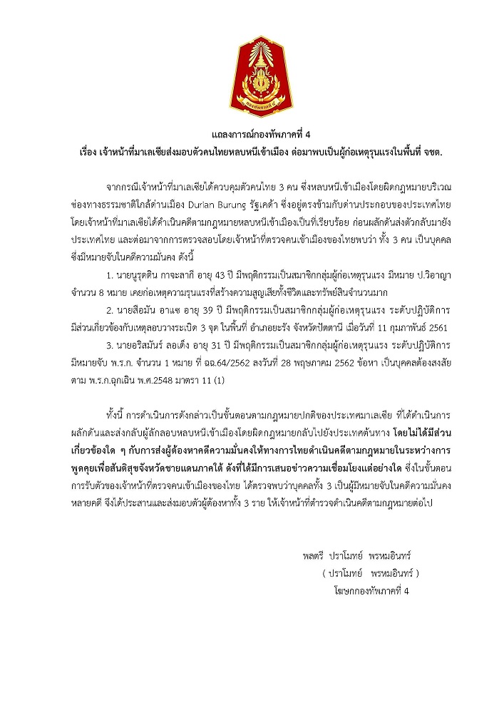 จากกรณีเจ้าหน้าที่มาเลเซียได้ควบคุมตัวคนไทย 3 คน ซึ่งหลบหนีเข้าเมืองโดยผิดกฎหมายบริเวณ ช่องทางธรรมชาติใกล้ด่านเมือง Durian Burung รัฐเคด้า ซึ่งอยู่ตรงข้ามกับด่านประกอบของประเทศไทย โดยเจ้าหน้าที่มาเลเซียได้ดำเนินคดีตามกฎหมายหลบหนีเข้าเมืองเป็นที่เรียบร้อย ก่อนผลักดันส่งตัวกลับมายัง ประเทศไทย และต่อมาจากการตรวจสอบโดยเจ้าหน้าที่ตรวจคนเข้าเมืองของไทยพบว่า ทั้ง 3 คน เป็นบุคคล ซึ่งมีหมายจับในคดีความมั่นคง ดังนี้