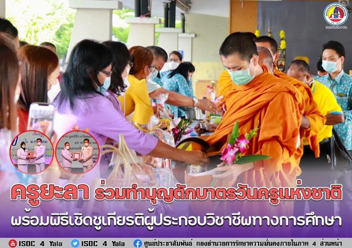 วันนี้ (16 ม.ค.65) เวลา 07.00 น. ที่หอประชุมเฉลิมพระเกียรติ 80 พรรษา 5 ธันวาคม 2550 มหาวิทยาลัยราชภัฏยะลา ครูและบุคลากรทางการศึกษาในพื้นที่ จ.ยะลา ได้ร่วมทำบุญตักบาตรข้าวสาร อาหารแห้ง เนื่องในวันครูประจำปี 2565 โดยมี นายภิรมย์ นิลทยา ผู้ว่าราชการจังหวัดยะลา เป็นประธานในพิธี พร้อมด้วยคณะข้าราชการครู อาจารย์ และบุคลากรทางการศึกษาในพื้นที่จังหวัดยะลา โดยมีพระสงฆ์จำนวน 9 รูป รับบิณฑบาต ทั้งนี้ การจัดกิจกรรมในวันครูเพื่อเป็นการอุทิศส่วนกุศลแด่ครูผู้มีพระคุณ และครูที่ได้เสียชีวิตจากเหตุการณ์ความไม่สงบในพื้นที่ 3 จังหวัดชายแดนภาคใต้ตลอดห้วงระยะเวลาที่ผ่านมา