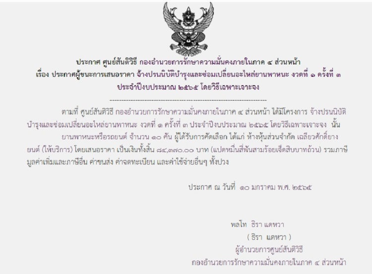 จัดซื้อ จัดจ้างประกาศผู้ชนะการเสนอราคา ประกาศผู้ชนะการเสนอราคา จ้างปรนนิบัติบำรุงและซ่อมเปลี่ยนอะไหล่ยานพาหนะ งวดที่ 1 ครั้งที่ 3 ประจำปีงบประมาณ 2565 โดยวิธีเฉพาะเจาะจง (84,370 บาท) January 17, 2022 497 Share Facebook Twitter Google+ Telegram LINE