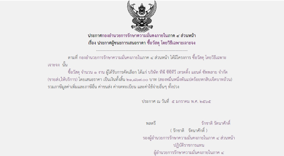 ประกาศผู้ชนะการเสนอราคา ซื้อวัสดุ โดยวิธีเฉพาะเจาะจง