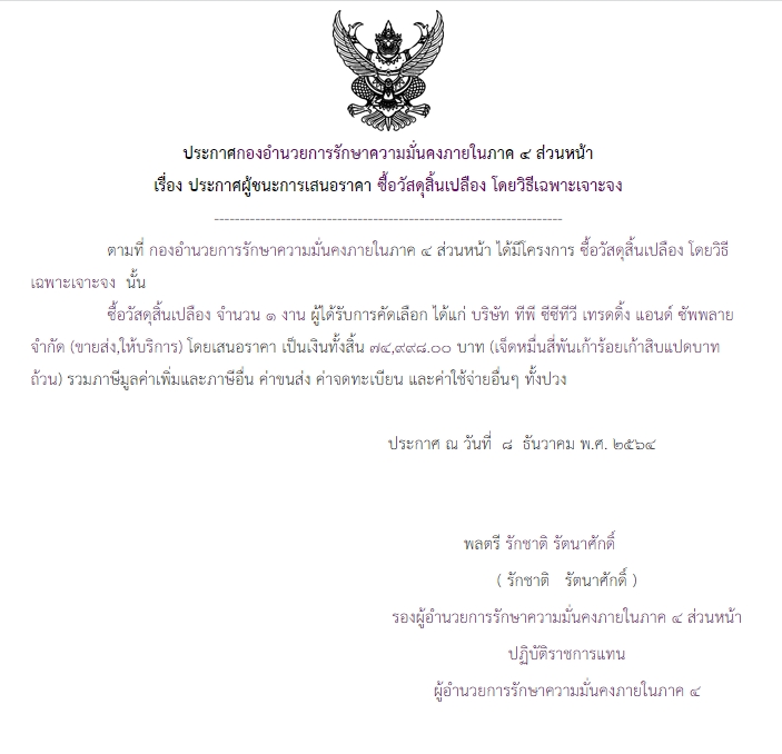 ประกาศผู้ชนะการเสนอราคา ซื้อวัสดุสิ้นเปลือง โดยวิธีเฉพาะเจาะจง