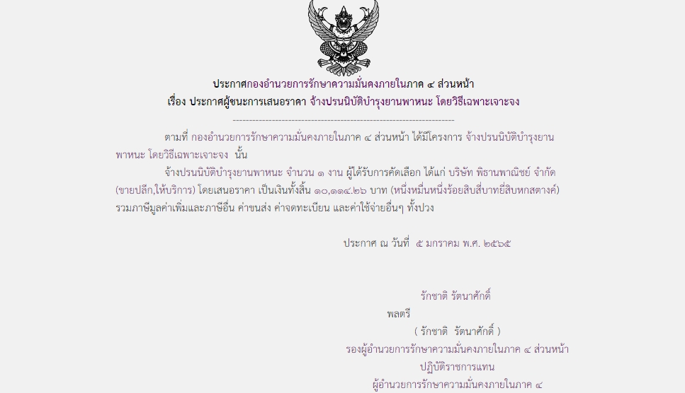 ประกาศผู้ชนะการเสนอราคา จ้างปรนนิบัติบำรุงยานพาหนะ โดยวิธีเฉพาะเจาะจง