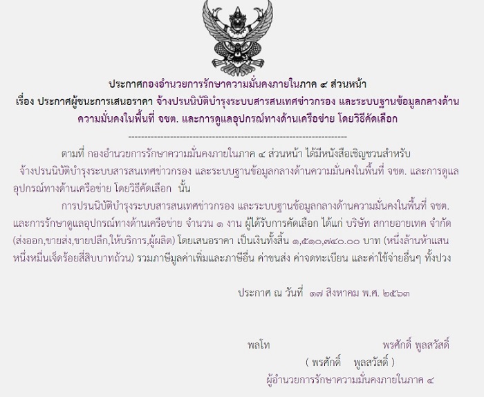 ประกาศผู้ชนะการเสนอราคา จ้างปรนนิบัติบำรุงระบบสารสนเทศข่าวกรอง และระบบฐานข้อมูลกลางความมั่นคงในพื้นที่ จชต. และการดูแลอุปกรณ์ทางด้านเครือข่าย โดยวิธีคัดเลือก (1,510,740.00)