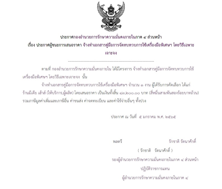 จัดซื้อ จัดจ้างประกาศผู้ชนะการเสนอราคา ประกาศผู้ชนะการเสนอราคา จ้างทำเอกสารคู่มือการจัดทบทวนการใช้เครื่องมือพิเศษฯ โดยวิธีเฉพาะเจาะจง (43,200 บาท) January 20, 2022 525 Share Facebook Twitter Google+ Telegram LINE