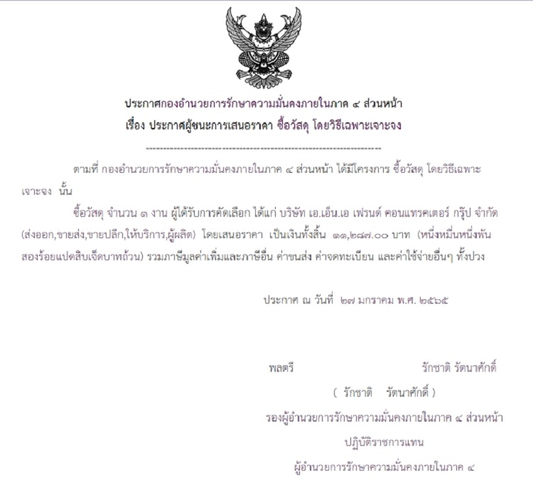 ประกาศผู้ชนะการเสนอราคา ซื้อวัสดุ โดยวิธีเฉพาะเจาะจง (11,287 บาท)