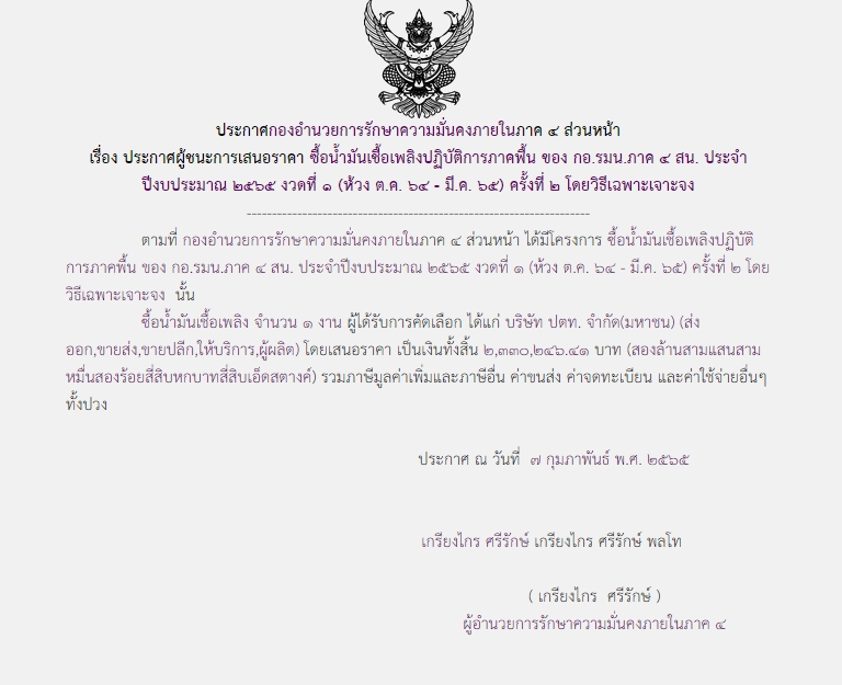 จัดซื้อ จัดจ้างประกาศผู้ชนะการเสนอราคา ประกาศผู้ชนะการเสนอราคา ซื้อน้ำมันเชื้อเพลิงปฏิบัติการภาคพื้น ของ กอ.รมน.ภาค ๔ สน. ประจำปีงบประมาณ ๒๕๖๕ งวดที่ ๑ (ห้วง ต.ค.๖๔-มี.ค.๖๕) ครั้งที่ ๒ โดยวิธีเฉพาะเจาะจง (๒,๓๓๐,๒๔๖.๔๑บาท) February 7, 2022 660 Share Facebook Twitter Google+ Telegram LINE