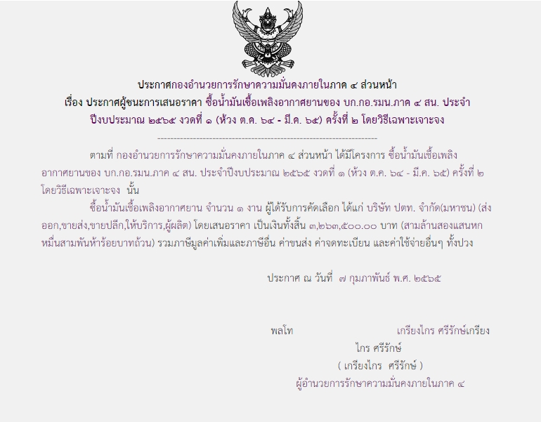 จัดซื้อ จัดจ้างประกาศผู้ชนะการเสนอราคา ประกาศผู้ชนะการเสนอราคา ซื้อน้ำมันเชื้อเพลิงอากาศยานของ บก.กอ.รมน.ภาค ๔ สน. ประจำปีงบประมาณ ๒๕๖๕ งวดที่ ๑ (ห้วง ต.ค.๖๔-มี.ค.๖๕) ครั้งที่ ๒ โดยวิธีเฉพาะเจาะจง (๓,๒๖๓,๕๐๐.๐๐บาท) February 7, 2022 473 Share Facebook Twitter Google+ Telegram LINE