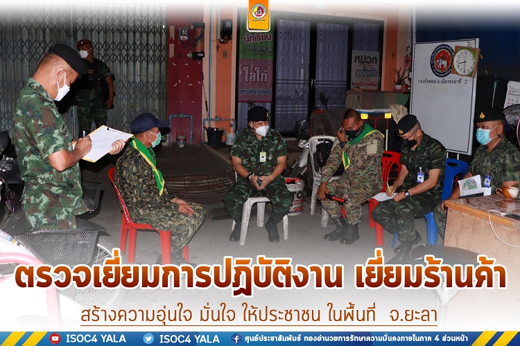 เมื่อวันที่ 6 กุมภาพันธ์ 2565 เวลา 20.00 น. พันเอก นิติ ติณสูลานนท์ รองเลขาธิการ กองอำนวยการรักษาความมั่นคงภายในภาค 4 ส่วนหน้า พร้อมคณะ ตรวจเยี่ยมการปฏิบัติงานในการรักษาความปลอดภัยเขตเทศบาลนครยะลา จำนวน 3 จุด ประกอบด้วย จุดตรวจป้อมตำรวจเซฟตี้โซน 1 ,จุดตรวจไทยอาสาป้องกันชาติถนนจงรัก และจุดตรวจป้อมสมาชิกกองอาสารักษาดินแดนถนนโปห้วยอุทิศ ซึ่งได้เน้นย้ำให้มีความพร้อมในการปฏิบัติหน้าที่เพื่อเพิ่มประสิทธิภาพในการดูแลพื้นที่ให้ปลอดภัย รวมทั้งได้นำข้อห่วงใยของ ผู้อำนวยการรักษาความมั่นคงภายในภาค 4 และผู้บังคับบัญชาทุกระดับ ชี้แจงให้กำลังพลได้รับทราบ รวมทั้งได้พบปะให้กำลังใจกลุ่มผู้ประกอบการร้านขายอาหารบริเวณหน้าบริษัทมาสด้า ถนนรวมมิตร อีกทั้งเป็นการตรวจเยี่ยมเพื่อให้ขวัญกำลังใจเจ้าหน้าที่ในการปฏิบัติหน้าที่ประจำจุดตรวจ ด่านตรวจ พร้อมเน้นย้ำให้เจ้าหน้าที่มีความเข้มงวดในการรักษาความปลอดภัย ตลอดจนพบปะสร้างความเชื่อมั่นให้กับประชาชน ซึ่งเจ้าหน้าที่พร้อมปฏิบัติงานเพื่อรักษาความปลอดภัยในชีวิตและทรัพย์สินของพี่น้องประชาชน
