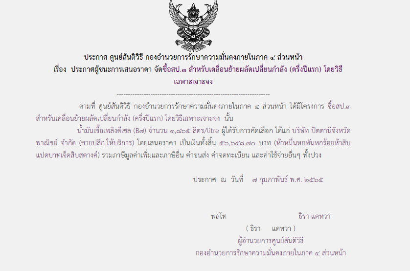 จัดซื้อ จัดจ้างประกาศผู้ชนะการเสนอราคา ประกาศผู้ชนะการเสนอราคา จัดซื้อ สป.๓ สำหรับเคลื่อนย้ายผลัดเปลี่ยนกำลัง (ครึ่งปีแรก) โดยวิธีเฉพาะเจาะจง (๕๖,๖๕๘.๗๐บาท) February 7, 2022 719 Share Facebook Twitter Google+ Telegram LINE