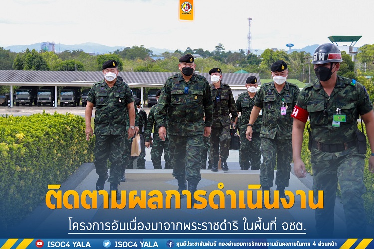 เมื่อวันที่ 9 กุมภาพันธ์ 2565 เวลา 10.40 น. ที่ ห้องประชุม 2 กองอำนวยการรักษาความมั่นคงภายในภาค 4 ส่วนหน้า ค่ายสิรินธร ตำบลเขาตูม อำเภอยะรัง จังหวัดปัตตานี พลเอก จิรเดช กมลเพ็ชร ที่ปรึกษาพิเศษกองทัพบก / ผู้อำนวยการสำนักงานประสานงานโครงการอันเนื่องมาจากพระราชดำริ และความมั่นคงกองทัพบก และคณะ เดินทางมาตรวจเยี่ยมติดตามผลการดำเนินงานโครงการอันเนื่องมาจากพระราชดำริ และงานตามนโนบายสั่งการผู้บัญชาการทหารบก ในพื้นที่จังหวัดชายแดนชายภาคใต้ ในระหว่างวันที่ 9 – 12 กุมภาพันธ์ 2565 โดยได้รับฟังสรุปข้อมูลผลการดำเนินโครงการอันเนื่องมาจากพระราชดำริ และโครงการทหารพันธุ์ดี ในพื้นที่สามจังหวัดชายแดนภาคใต้ ของศูนย์ประสานงานโครงการอันเนื่องมาจากพระราชดำริ และกองพลทหารราบที่ 15 โดยมี พลโท ธิรา แดหวา แม่ทัพน้อยที่ 4 / รองผู้อำนวยการรักษาความมั่นคงภายในภาค 4 ส่วนหน้า, พลตรี เฉลิมพร ขำเขียว ผู้บัญชาการกองพลทหารราบที่ 15 / ผู้อำนวยการศูนย์ประสานโครงอันเนื่องมาจากพระราชดำริ, พันเอก นิติ ติณสูลานนท์ รองเลขาธิการ กองอำนวยการรักษาความมั่นคงภายในภาค 4 ส่วนหน้า, หัวหน้าคณะทำงานโครงการอันเนื่องมาจากพระราชดำริ คณะที่ 1 – 4 พร้อมด้วยส่วนที่เกี่ยวข้องร่วมให้การต้อนรับ และเข้าร่วมการประชุมอย่างพร้อมเพรียง
