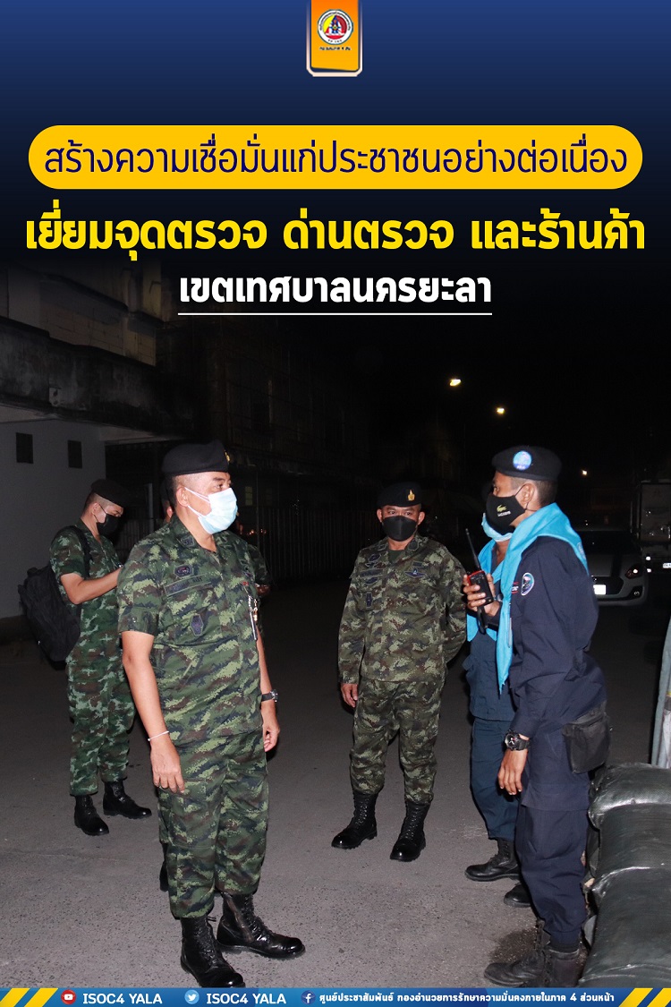 เมื่อวันที่ 9 กุมภาพันธ์ 2565 เวลา 19.30 น. พันเอก เฉลิมพงค์ คงบัว รองเลขาธิการ กองอำนวยการรักษาความมั่นคงภายในภาค 4 ส่วนหน้า, พันเอก ประสาทภพ หยะกังฉัตร์ รองผู้อำนวยการสำนักนโยบายและแผนกองอำนวยการรักษาความมั่นคงภายในภาค 4 ส่วนหน้า, ผู้แทนสำนักมวลชนและกิจการพิเศษกองอำนวยการรักษาความมั่นคงภายในภาค 4 ส่วนหน้า, ผู้แทน หน่วยเฉพาะกิจยะลา และ ผู้แทน หน่วยเฉพาะกิจตำรวจยะลาที่ 91 ลงพื้นที่ตรวจเยี่ยมการปฏิบัติงาน ตามคำสั่งของผู้อำนวยการรักษาความมั่นคงภายในภาค 4 ส่วนหน้า ประจำจุดตรวจ ด่านตรวจ พื้นที่เซฟตี้โซน จำนวน 4 จุด ได้แก่ ด่านตรวจท่าสาป, จุดตรวจแยกโกวิทพาณิชย์ (ตลาดใหม่) ของไทยอาสาป้องกันชาติ (ทสปช.) , ตลาดพิมลชัย, จุดตรวจวิฑูรอุทิศ 10 ของหมวดที่ 5 กำกับการปฏิบัติการพิเศษตำรวจภูธรจังหวัดยะลา, ร้านข้าวต้ม หยก-ตง เพื่อเป็นขวัญและกำลังใจให้กับกำลังพลในการปฏิบัติหน้าที่และผู้ประกอบการร้านค้าต่างๆ ในเขตเทศบาลเมืองยะลา ผลการปฏิบัติเป็นไปด้วยความเรียบร้อย ตามสั่งการของผู้อำนวยการรักษาความมั่นคงภายในภาค 4 อีกทั้งเป็นการสร้างความเชื่อมั่นให้กับพี่น้องประชาชน พร้อมกันนี้ยังได้เน้นย้ำกำลังพลให้มีความพร้อมในการรักษาความปลอดภัย การควบคุมพื้นที่ กำชับกำลังพลเพิ่มความระมัดระวังในการปฏิบัติหน้าที่อีกด้วย