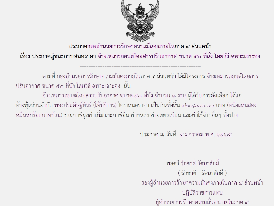ประกาศผู้ชนะการเสนอราคา จ้างเหมารถยนต์โดยสารปรับอากาศ ขนาด ๕๐ ที่นั่ง โดยวิธีเฉพาะเจาะจง ( ๑๒๐,๖๐๐,๐๐บาท )