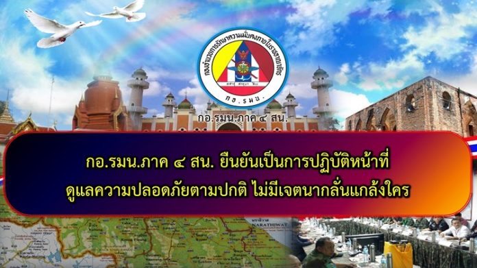 ทั้งนี้ กองอำนวยการรักษาความมั่นคงภายในภาค 4 ส่วนหน้า ขอเรียนให้ทราบว่าการปฏิบัติงานในทุกขั้นตอน ได้ดำเนินการตามหน้าที่และยึดมั่นในหลักการใช้กฎหมายด้วยความเสมอภาค และเท่าเทียมกันภายใต้หลักนิติรัฐ โดยไม่เลือกปฏิบัติต่อผู้หนึ่งผู้ใด รวมทั้งให้ความสำคัญ กับสิทธิมนุษยชนอย่างเคร่งครัด และต้องขอความร่วมมือพี่น้องประชาชนกรุณาบริโภคข้อมูลข่าวสาร ด้วยความระมัดระวัง โดยใช้วิจารณญาณตรวจสอบข้อเท็จจริงอย่างรอบด้าน เพื่อไม่ให้ตกเป็นเครื่องมือของกลุ่มบุคคลหรือผู้หนึ่งผู้ใด หากพบเห็นหรือมีปัญหาเกี่ยวกับการปฏิบัติของเจ้าหน้าที่ที่ไม่ถูกต้อง