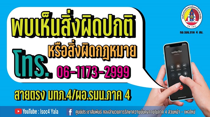 สามารถแจ้งมาได้ที่หมายเลขโทรศัพท์สายตรง แม่ทัพภาคที่ 4 / ผู้อำนวยการรักษาความมั่นคงภายในภาค 4 หมายเลข 061-1732999 หรือ หมายเลข 1341 ได้ตลอด 24 ชั่วโมง