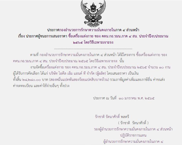 จัดซื้อ จัดจ้างประกาศผู้ชนะการเสนอราคา ประกาศผู้ชนะการเสนอราคา ซื้อเครื่องแต่งกาย ของ คตน.กอ.รมน.ภาค ๔ สน.ประจำปีงบประมาณ ๒๕๖๕ โดยวิธีเฉพาะเจาะจง ( ๒๘,๒๘๐.๐๐บาท ) February 11, 2022 452 Share Facebook Twitter Google+ Telegram LINE
