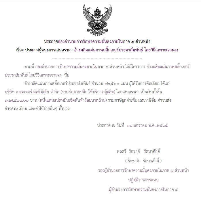 ประกาศผู้ชนะการเสนอราคา จ้างผลิตแผ่นภาพสติ๊กเกอร์ประชาสัมพันธ์ โดยวิธีเฉพาะเจาะจง (๑๘๗,๕๐๐.๐๐บาท)