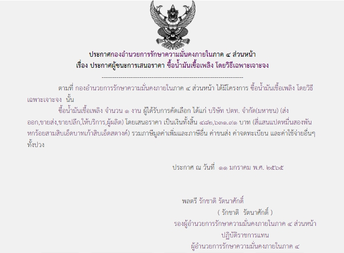 ประกาศผู้ชนะการเสนอราคา ซื้อน้ำมันเชื้อเพลิง โดยวิธีเฉพาะเจาะจง (๔๘๒,๖๓๑.๙๑ บาท)