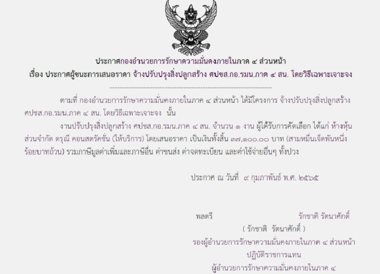 จัดซื้อ จัดจ้างประกาศผู้ชนะการเสนอราคา ประกาศผู้ชนะการเสนอราคา จ้างปรับปรุงสิ่งปลูกสร้าง ศปชส.กอ.รมน.ภาค. 4 สน. โดยวิธีเฉพาะเจาะจง (37,100 บาท) February 14, 2022 500 Share Facebook Twitter Google+ Telegram LINE