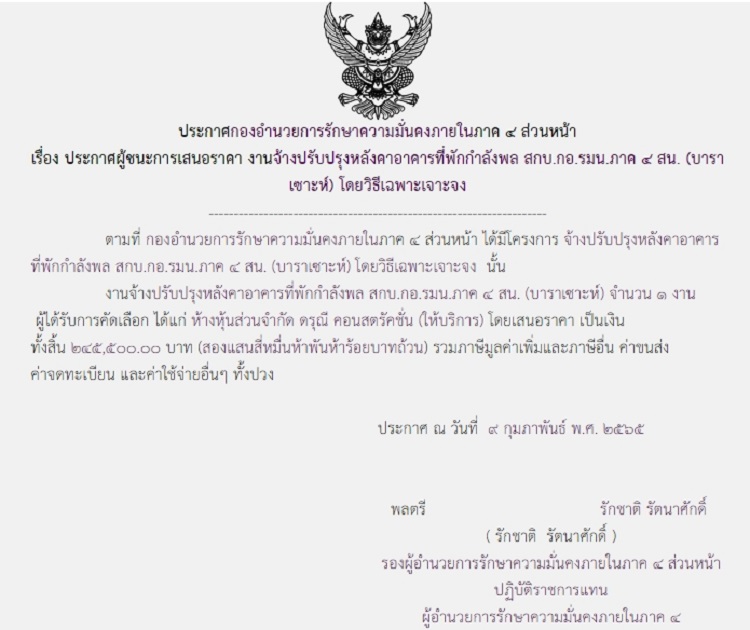 จัดซื้อ จัดจ้างประกาศผู้ชนะการเสนอราคา ประกาศผู้ชนะการเสนอราคา งานจ้างปรับปรุงหลังคาอาคารที่พักกำลังพล สกบ.กอ.รมน.ภาค 4 สน. (บาราเซาะห์) โดยวิธีเฉพาะเจาะจง (245,500 บาท) February 14, 2022 537 Share Facebook Twitter Google+ Telegram LINE