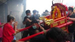 หลังจากองค์พระทั้ง 4 องค์ เสร็จสิ้นการลุยน้ำ บางองค์จะพาขึ้นรถยนต์เพื่อไปปักหลักตามที่ต่างๆ ในอาณาเขตที่กำหนด ส่วนองค์เจ้าแม่ฯจะถูกแบกเดินไปตามเส้นทางที่กำหนดไว้ โดยจะแวะเพื่อให้พี่น้องประชาชนที่ตั้งโต๊ะรับพระได้จุดธูปรับองค์เจ้าแม่ฯ โดยไม่มีการนำองค์พระเข้าไปภายในบ้าน แม้อยู่ในช่วงของสถานการร์โควิด-19 แต่บรรยากาศก็เป็นไปอย่างคึกคัก เมื่อครบทุกเส้นทางที่กำหนด ก็จะนำองค์พระทั้ง 4 องค์กลับมาเตรียมความพร้อมทำพิธีลุยไฟที่หน้าศาลเจ้าเล่งจู่เกียง ต.อาเนาะรู จ.ปัตตานี เวลา 11.00 น. ของวันนี้