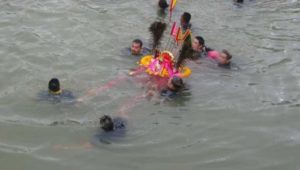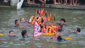 สำหรับบรรยากาศ ริมแม่น้ำปัตตานี เสียงประทัดหลายพันนัดดังกึกก้องเต็มถนน ก่อนมีคนหามเกี้ยวองค์พระทั้ง 4 องค์ ได้เดินทางมาถึงแม่น้ำปัตตานี โดยมีผู้ว่าราชการจังหวัดปัตตานี และรองผู้ว่าราชการจังหวัดปัตตานี ได้กราบไหว้ขอพร จากนั้นขบวนแห่ได้แบกเกี้ยวองค์พระ ลงไปในแม่น้ำปัตตานี โดยจะลงลุยน้ำพร้อมกัน ข้ามไปอีกฝั่งหนึ่งไกลถึง 70 เมตร ซึ่งขณะนั้นก็ได้มีฝนตกลงมาปรอยๆ ทั้งนี้พิธีลุยน้ำก็เพื่อเป็นการรำลึกถึงองค์เจ้าแม่ลิ้มกอเหนี่ยว ที่ได้ข้ามน้ำข้ามทะเลจากเมืองจีนและเพื่อความสิริมงคล ให้ค้าขายดี ชำระร่างกายจิตใจให้บริสุทธิ์