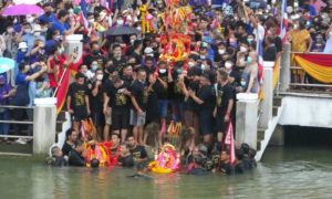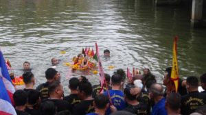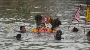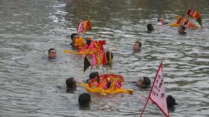 สำหรับคนหามเกี้ยวจะต้องมีความแข็งแรงที่สุด ต้องแบกเกี้ยวองค์พระทั้ง 4 องค์ลงน้ำข้ามไปอีกฝั่ง เกี้ยวก็มีความหนัก บางคนเริ่มมีอาการอ่อนล้า แต่เสียงเชียร์และกำลังใจของประชาชนสองฝั่ง จึงทำให้คนหามเกี้ยวข้ามฝั่งไปได้