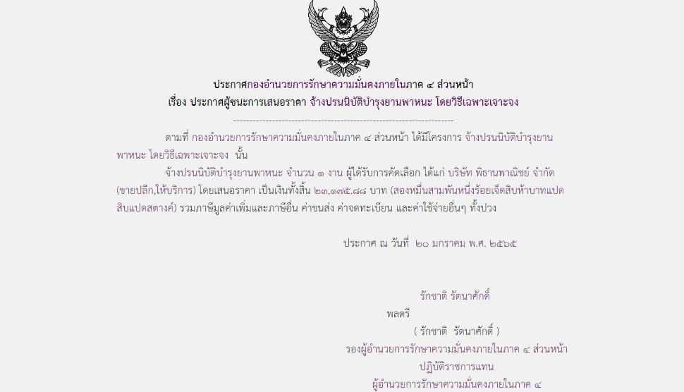 ประกาศผู้ชนะการเสนอราคา จ้างปรนนิบัติบำรุงยานพาหนะ โดยวิธีเฉพาะเจาะจง